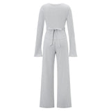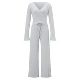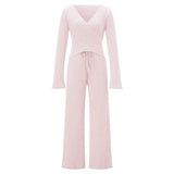 The V-Neck Long-Sleeve Lounge Set is loved for how effortlessly it balances comfort and shape. The soft, breathable fabric with gentle stretch feels light on the body, while the slim-fit top and flowing wide-leg pants create a flattering silhouette without feeling restrictive.